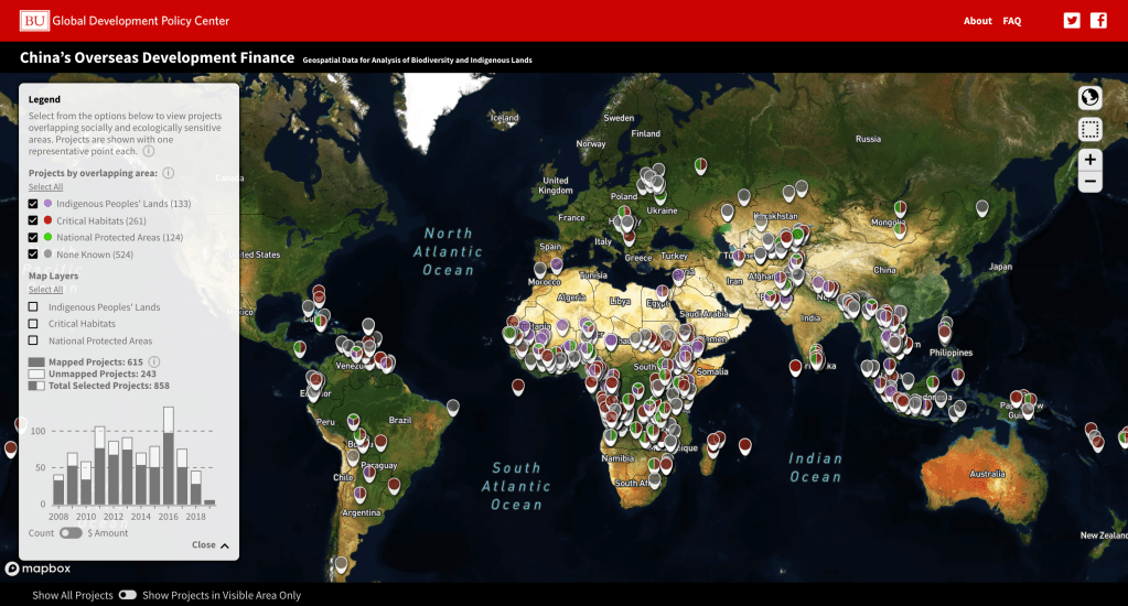 This ongoing project examines the scale and distribution of risks to global biodiversity and indigenous lands from projects financed by China’s policy banks between 2008 and 2019 and compares these risks with those associated with similar projects financed by the World Bank. We incorporate critical habitats (habitats recognized by the International Finance Corporation to be of great biological importance), national marine and terrestrial protected areas, and hotspots of threatened species as ecologically sensitive territories to assess risk based upon their contribution to biodiversity and national (and international) conservation targets. Indigenous peoples’ lands are also included, as projects within these territories may bring greater risks of social and political conflict over indigenous rights and welfare.